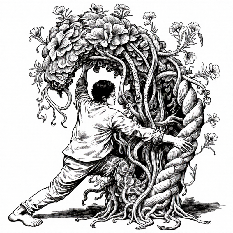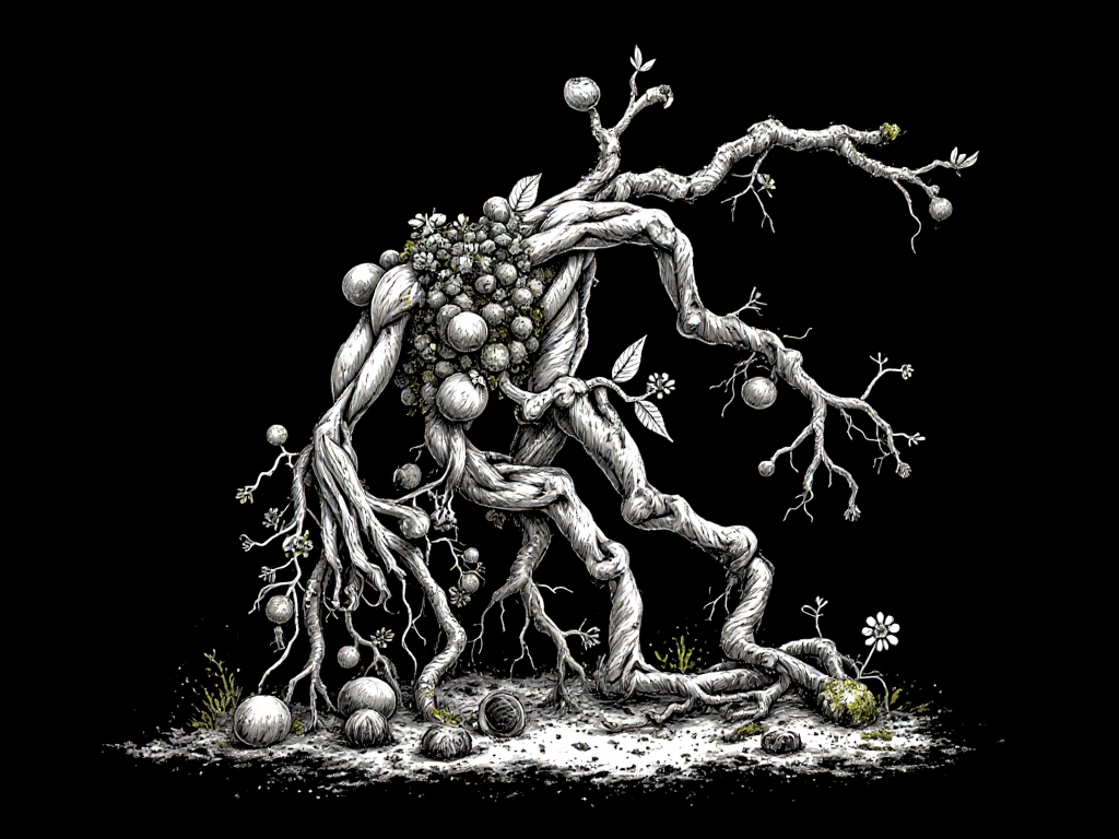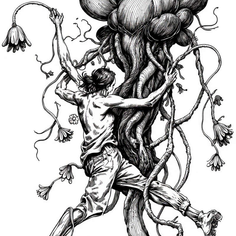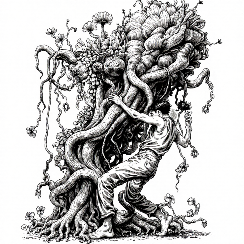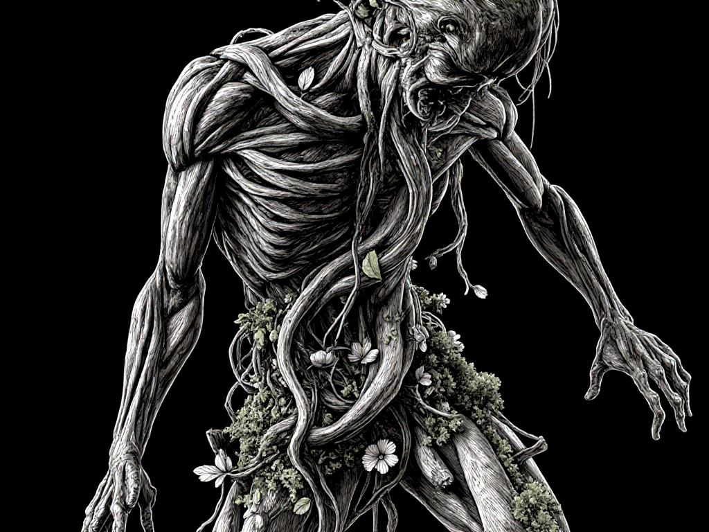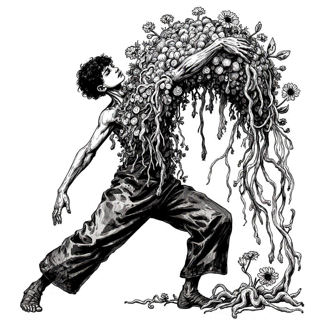 create a b/w ink brush illustration of an androgyn person who is controlling and morphing into a huge non-human abstract sculpture in some kind of dance. the sculpture is made from overgrown botany made from creepers, roots, membranes, lamellae and flower blossoms . the person is also entirely overgrown by the sculpture and in dynamic dance motion.