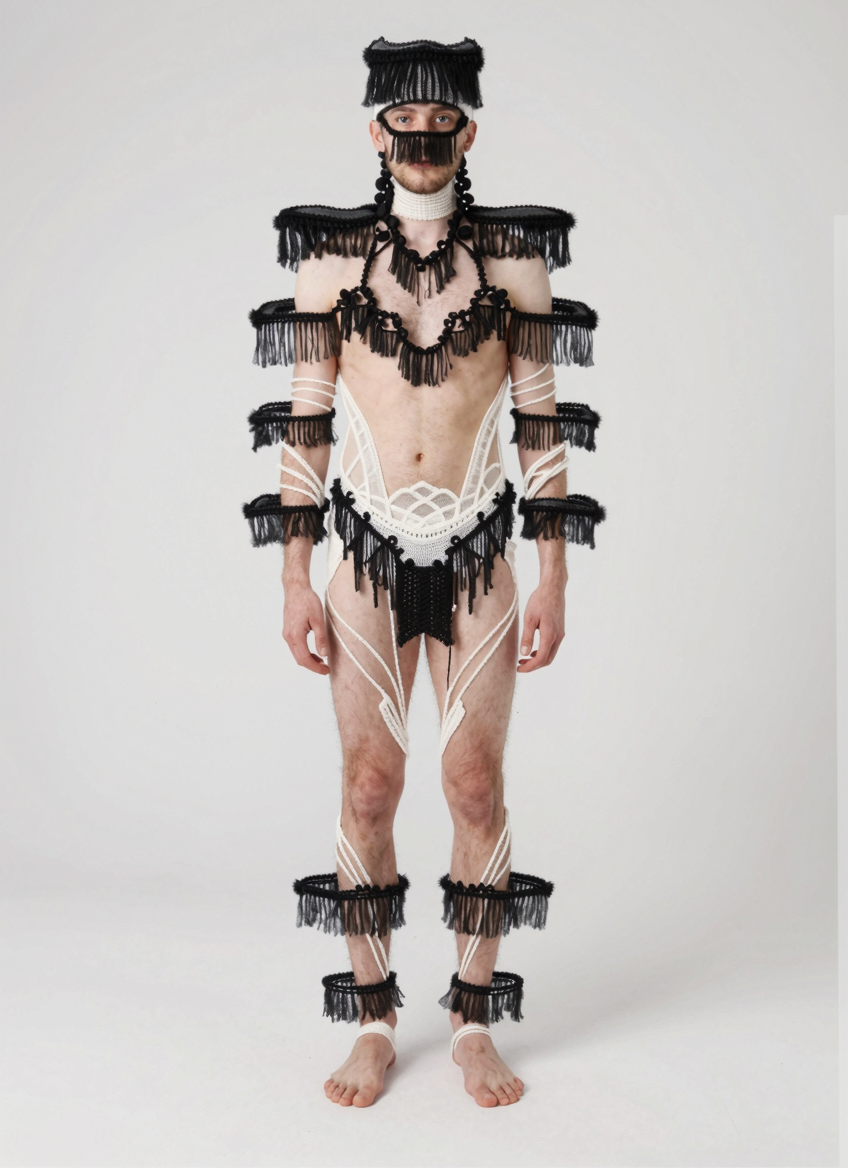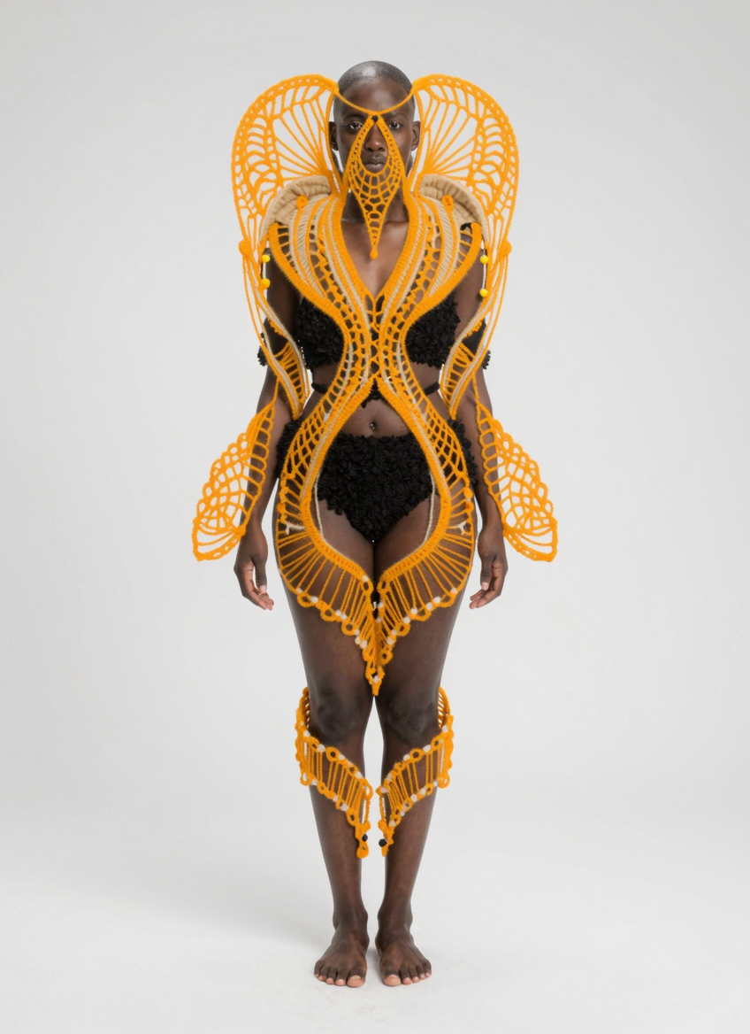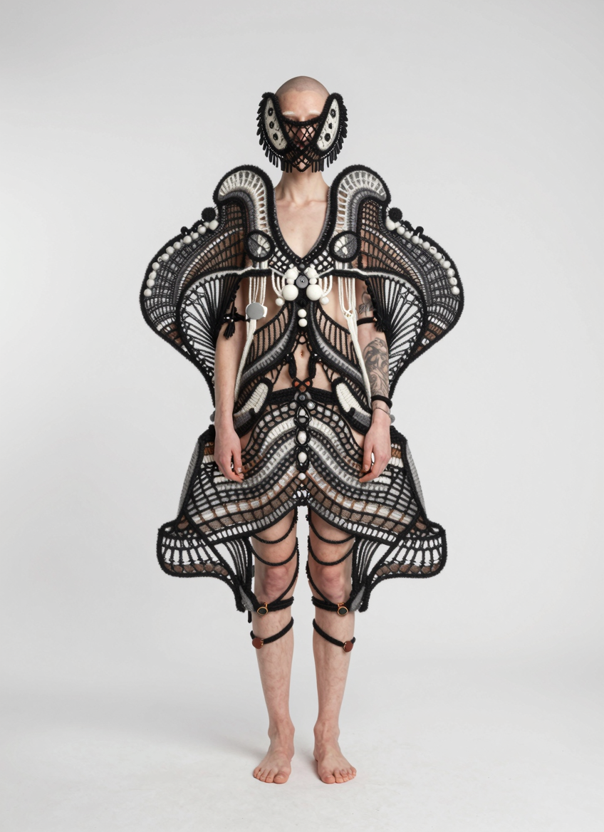 an androgyn person in an excentric costume/wearable sculpture body architecture inspired by Ernst Haeckel’s plate illustrations of bio shapes like Clathrocanium reginae or radiolara.
