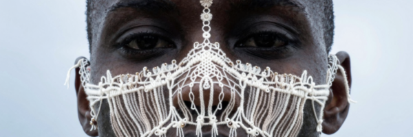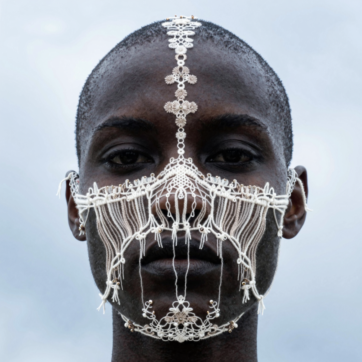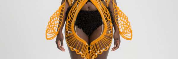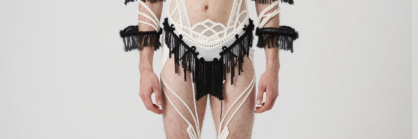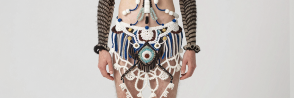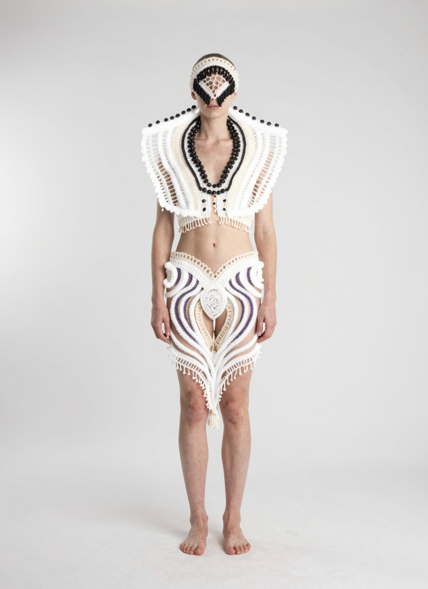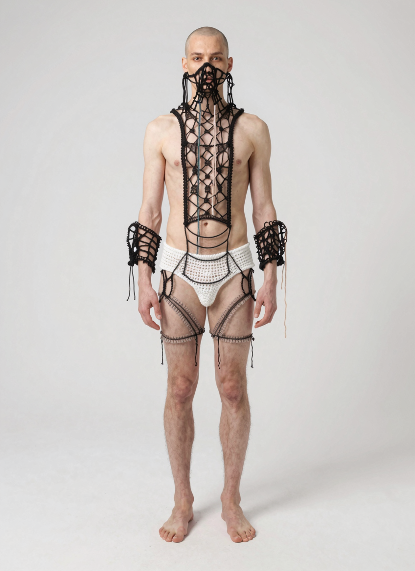 an androgyn person in an excentric costume/wearable sculpture body architecture inspired by Ernst Haeckel’s plate illustrations of bio shapes like Clathrocanium reginae or radiolara.