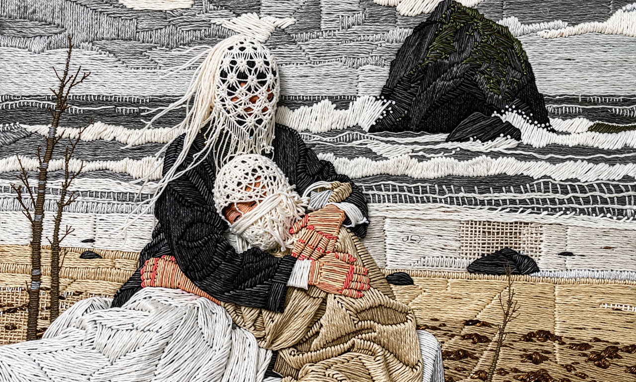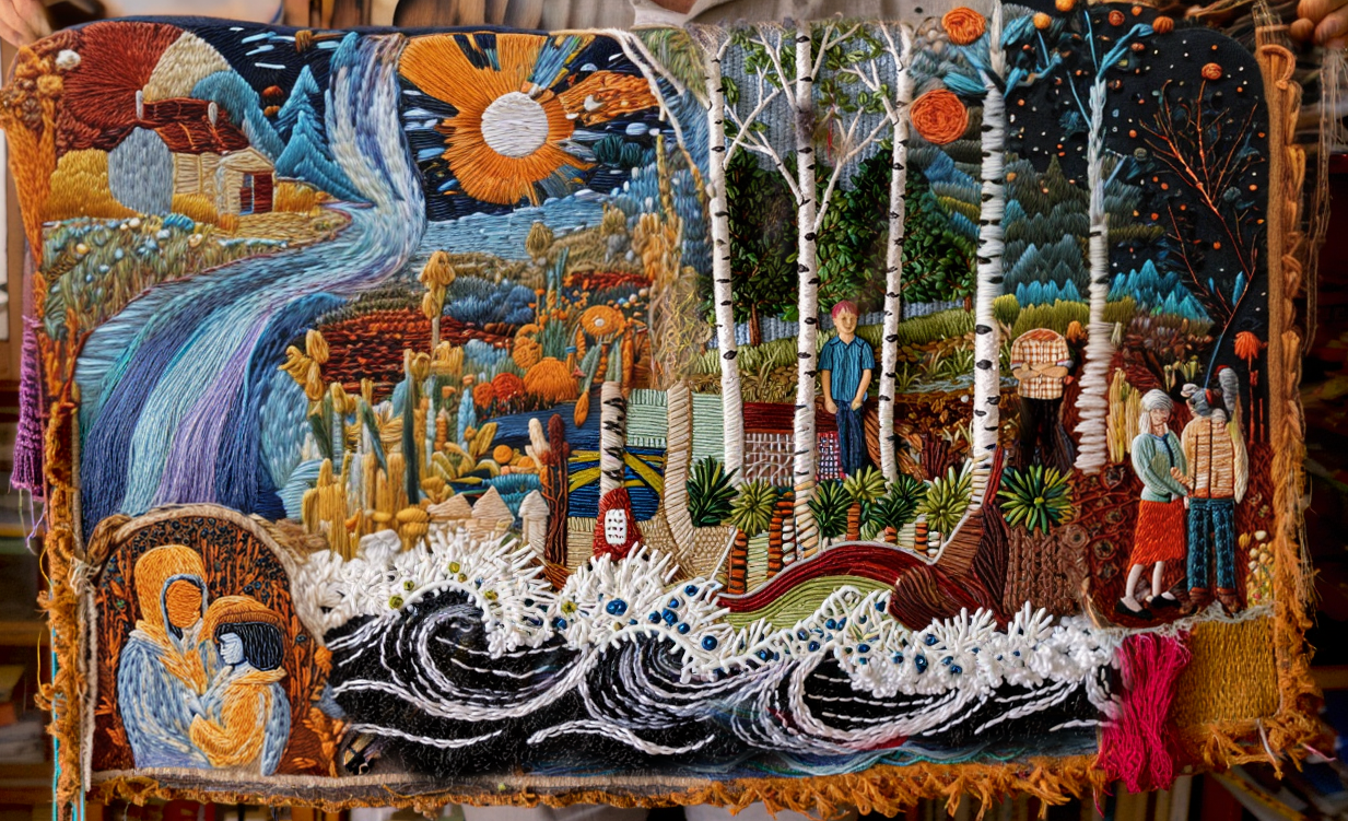 the overall style of the textile piece is wild amateurish embroidery technique, wild rough collage, very different materials.