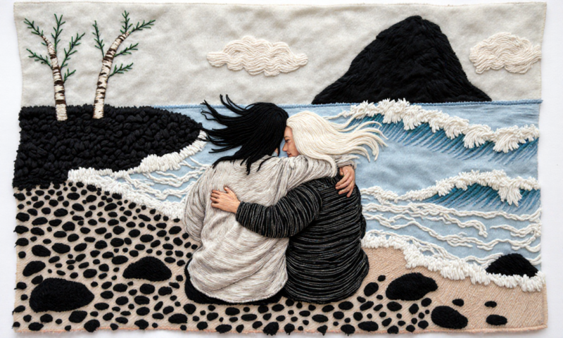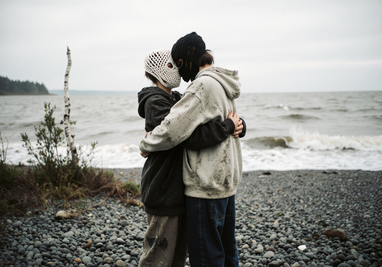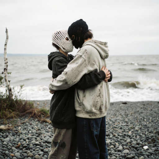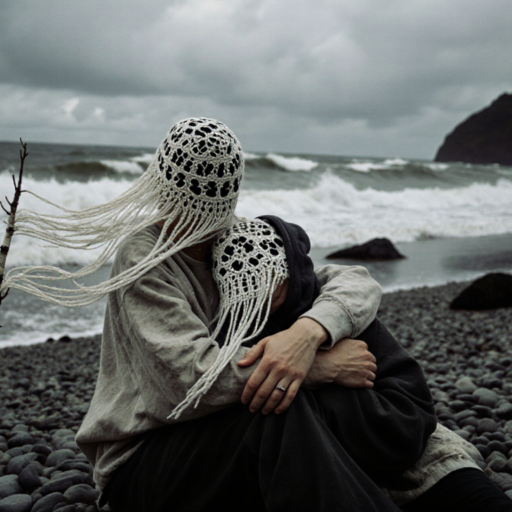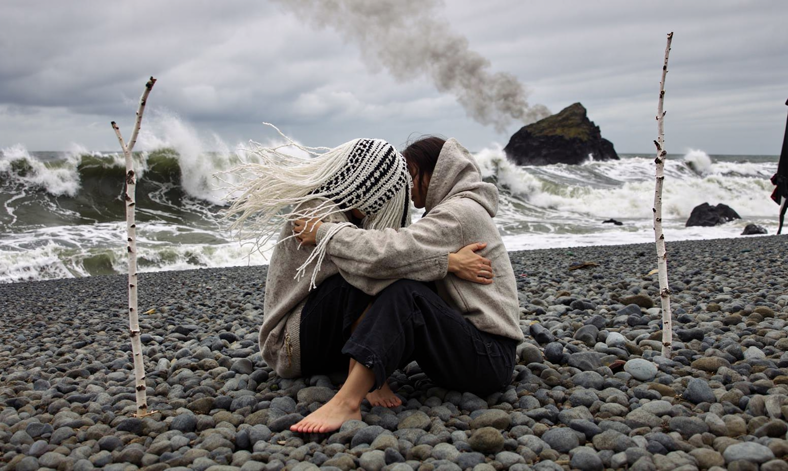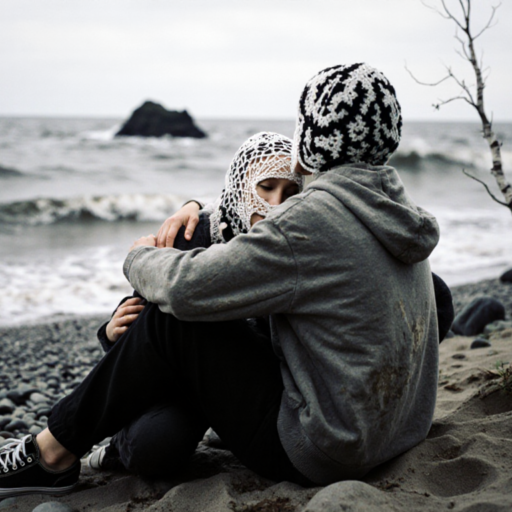 two androgyn female person sit on a wild broken cobble beach holding hands holding themselves in their arms, in love hugging hurting, one person has her head in the lap of the other person.