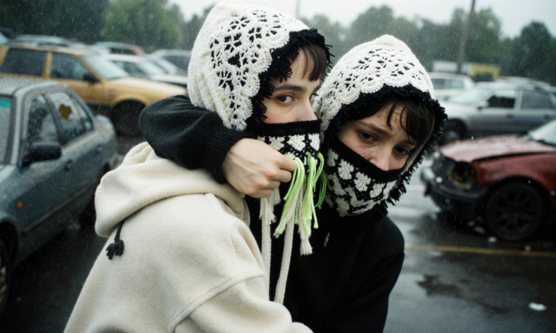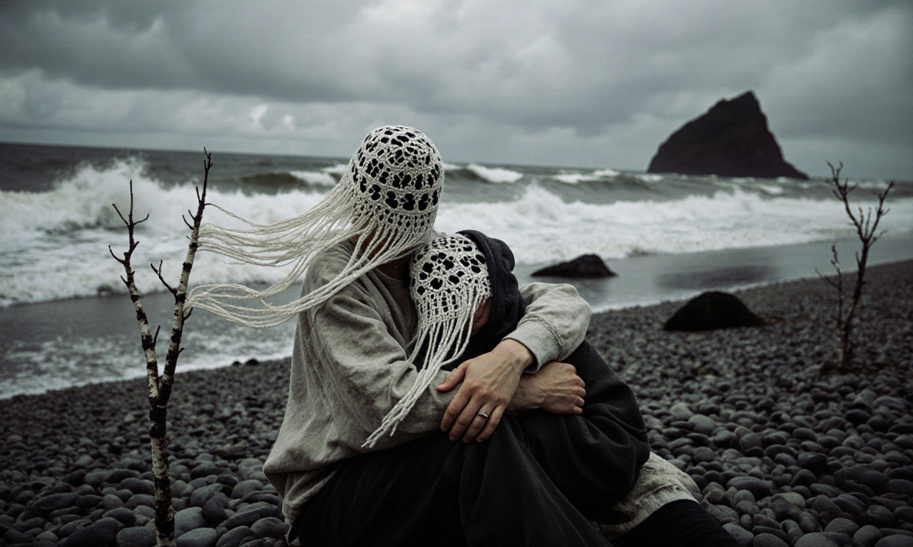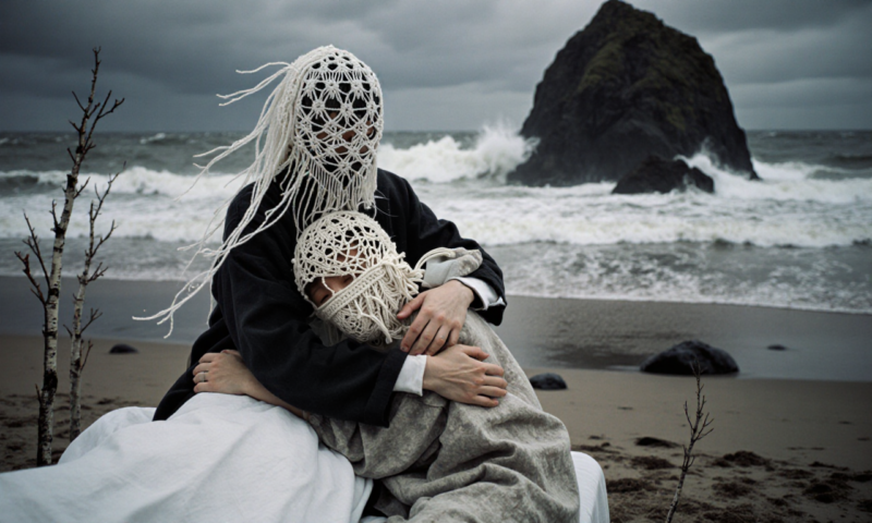both persons wear handmade loose lace head mask sculptures made from very thin fine white and black yarn with wild black and white patterns – the masks cover the head, each with long fringes, that blow in the wind.