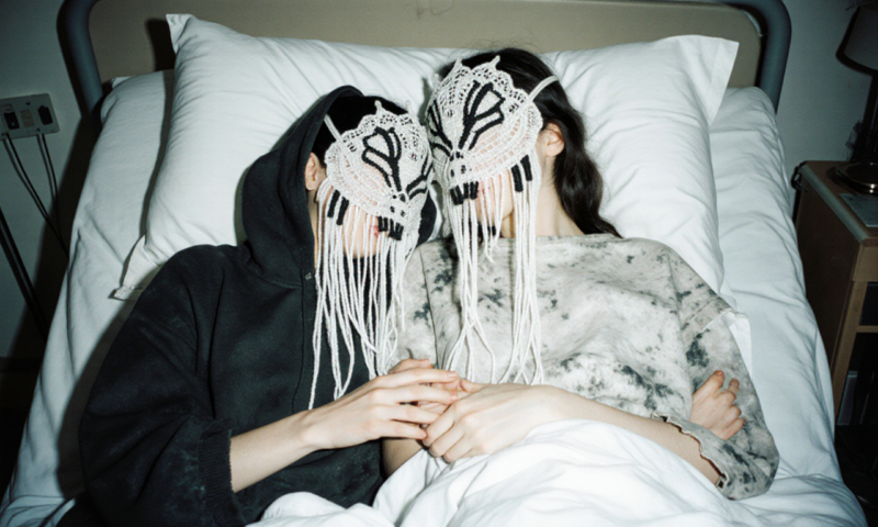 both persons wear handmade loose lace head mask sculptures made from very thin fine white and black yarn with wild black and white patterns – the masks cover the head, each with long fringes,