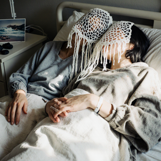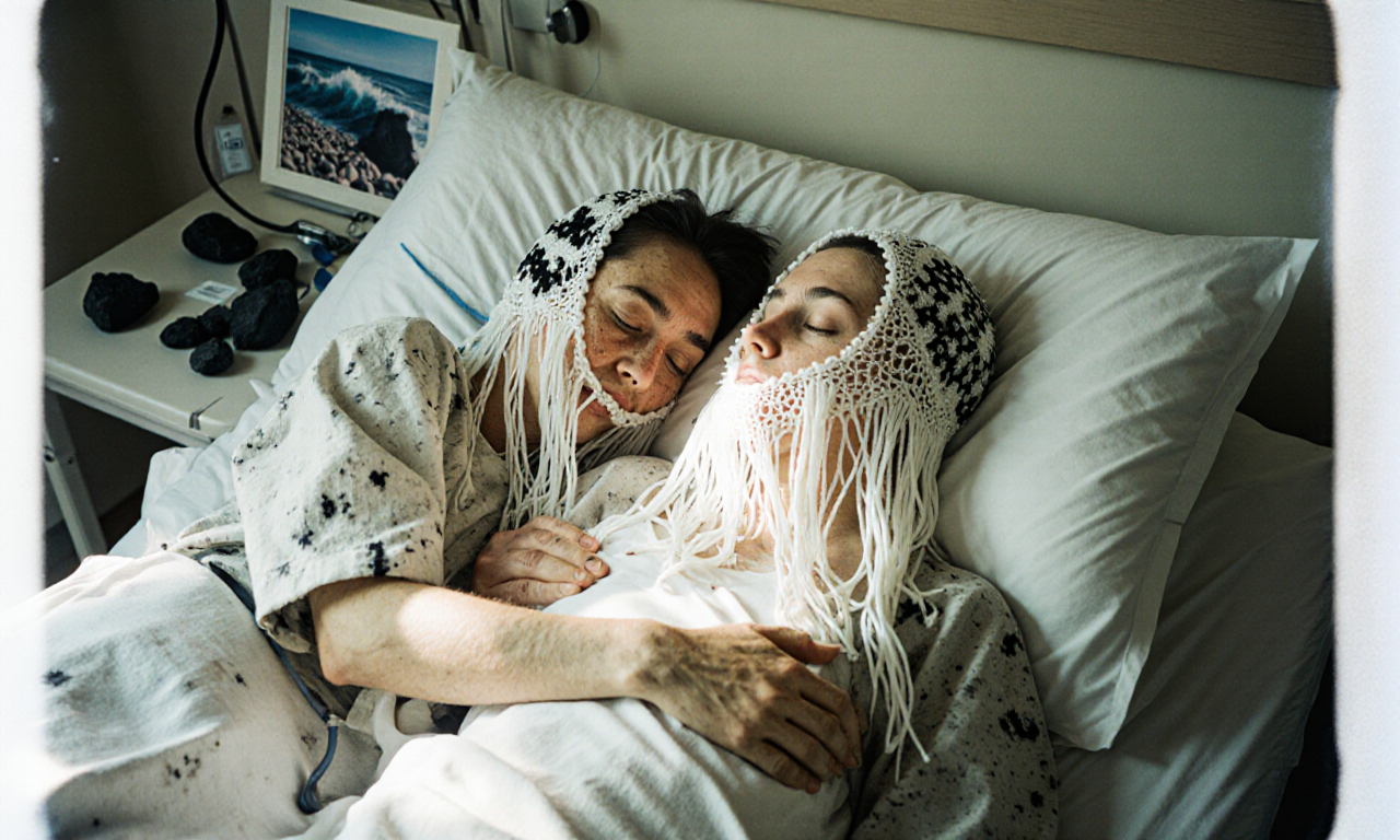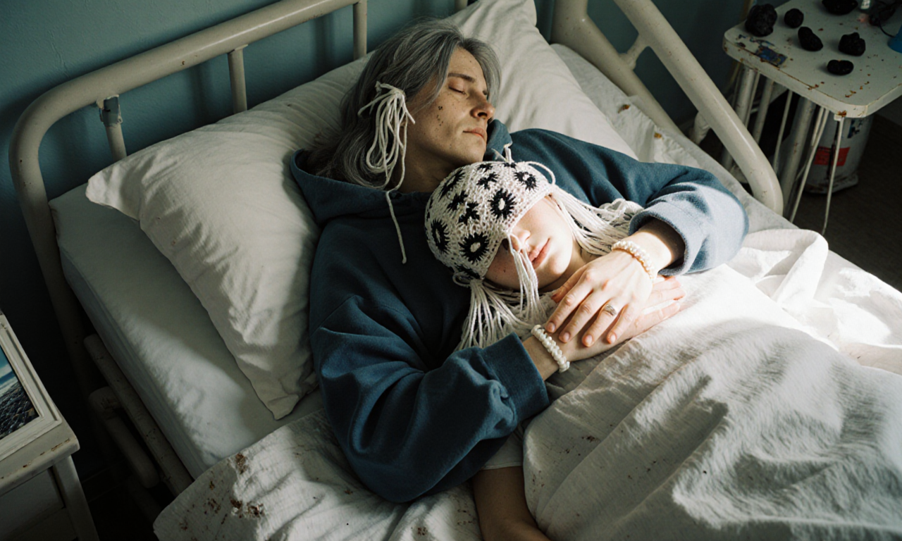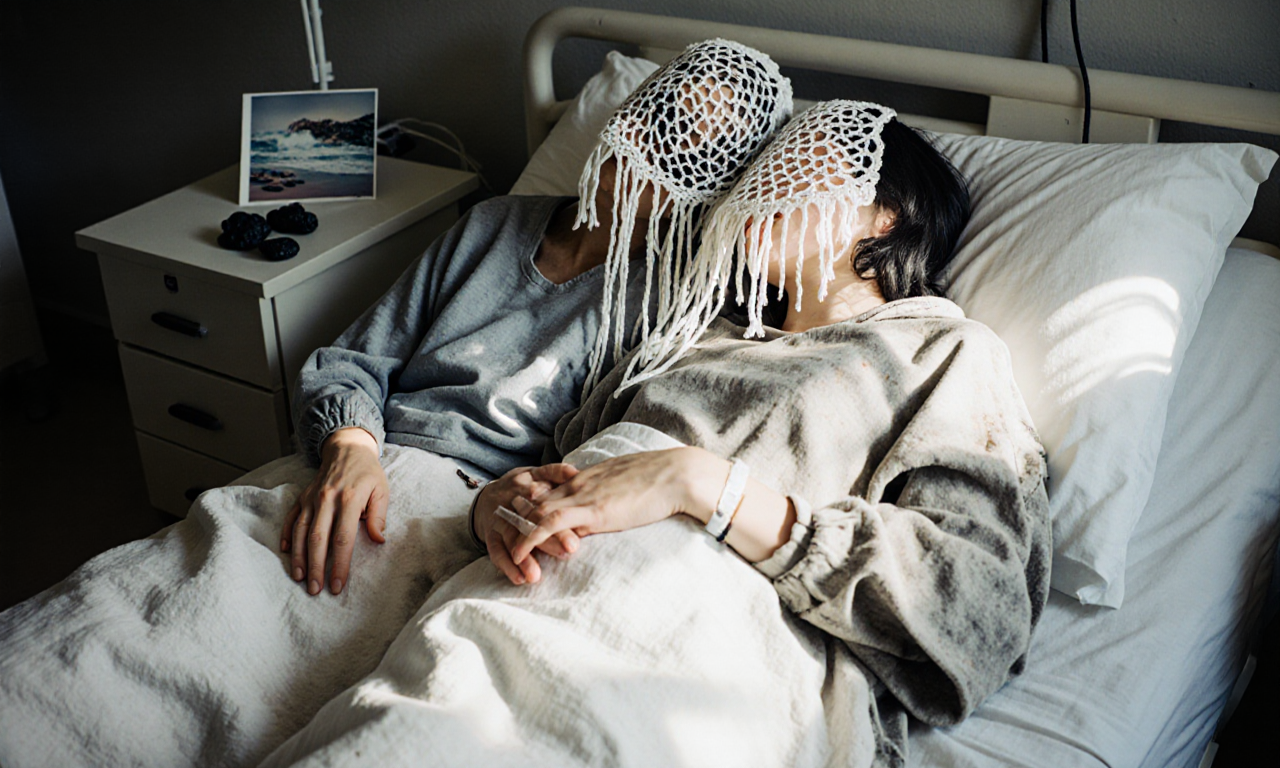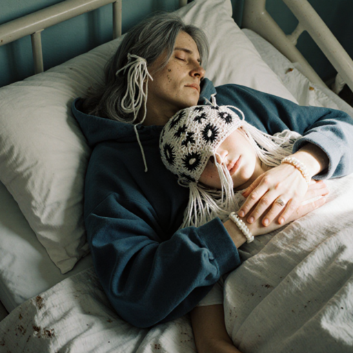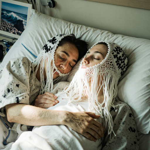 two androgyn different persons of different hair style with some grey hair, realisitic skin and tiny wrinkles lie on a hospital bed holding hands holding themselves in their arms, in love hugging hurting, one person has her head in the lap of the other person.