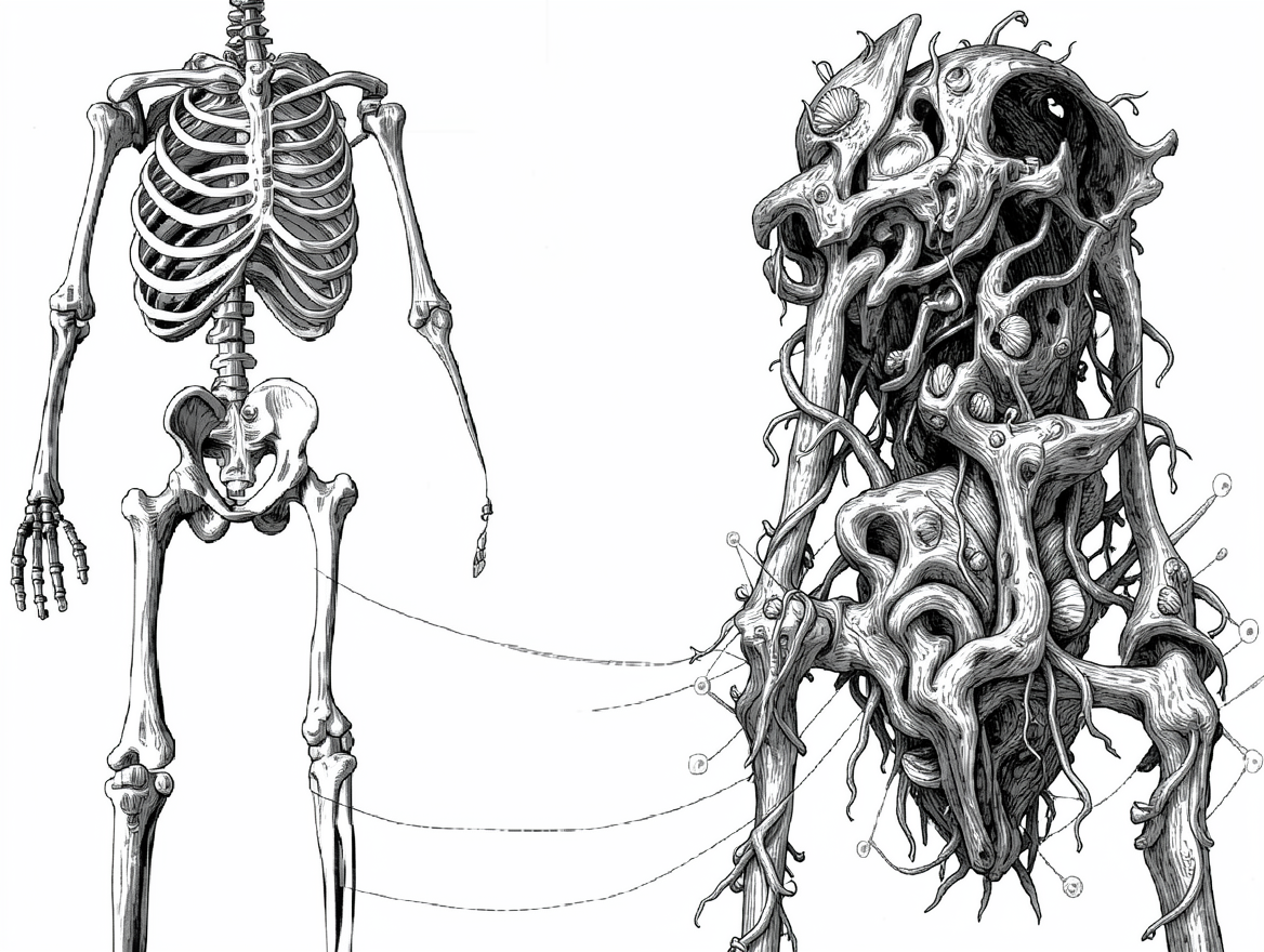 The motion of each bone is mapped to several bones to a speculative generative morphology. Dimensions of the humanoid armature bones are modified, bone sequence is modified.