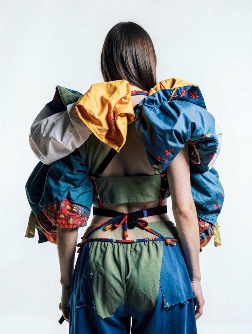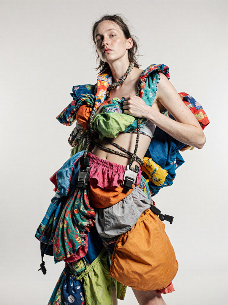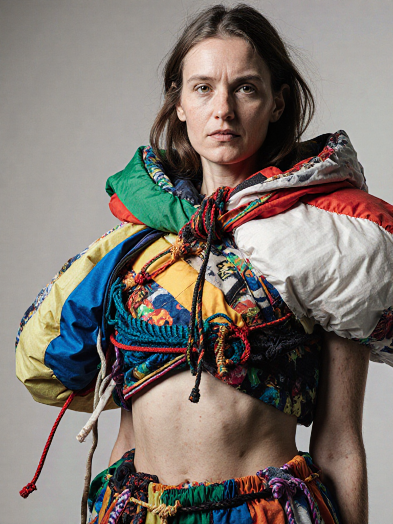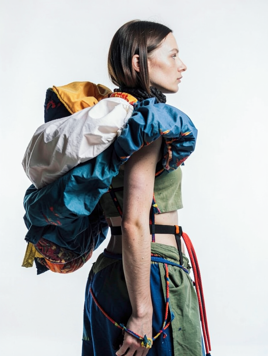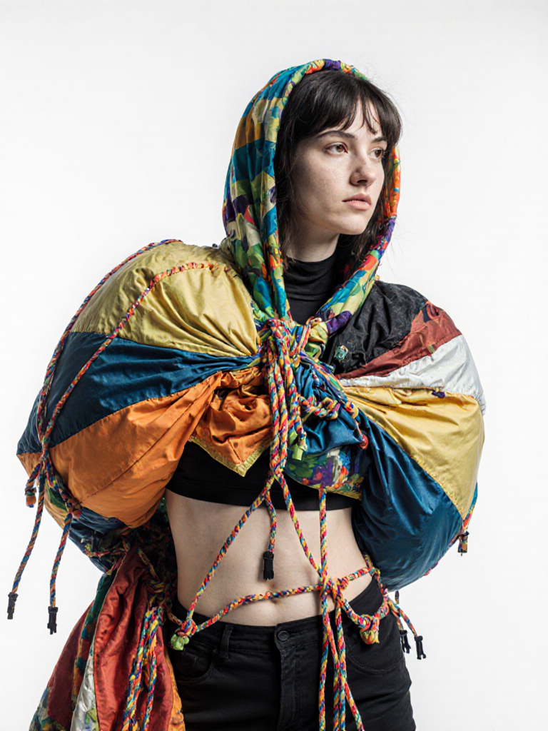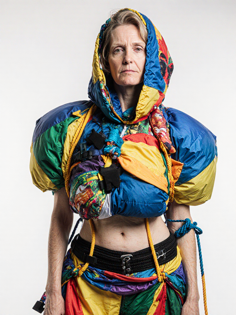 tied-up recycled ski clothes, textile scraps, colorful syntetic outdoor fabric are attached loosely to the body. The synthetic textile components are arranged in a wild, chaotic, and asymmetrical manner and are improvised to the body with thin ropes, Velcro, and small straps. with overlaps, multi layered, twisted, folded, inflated, collaged.