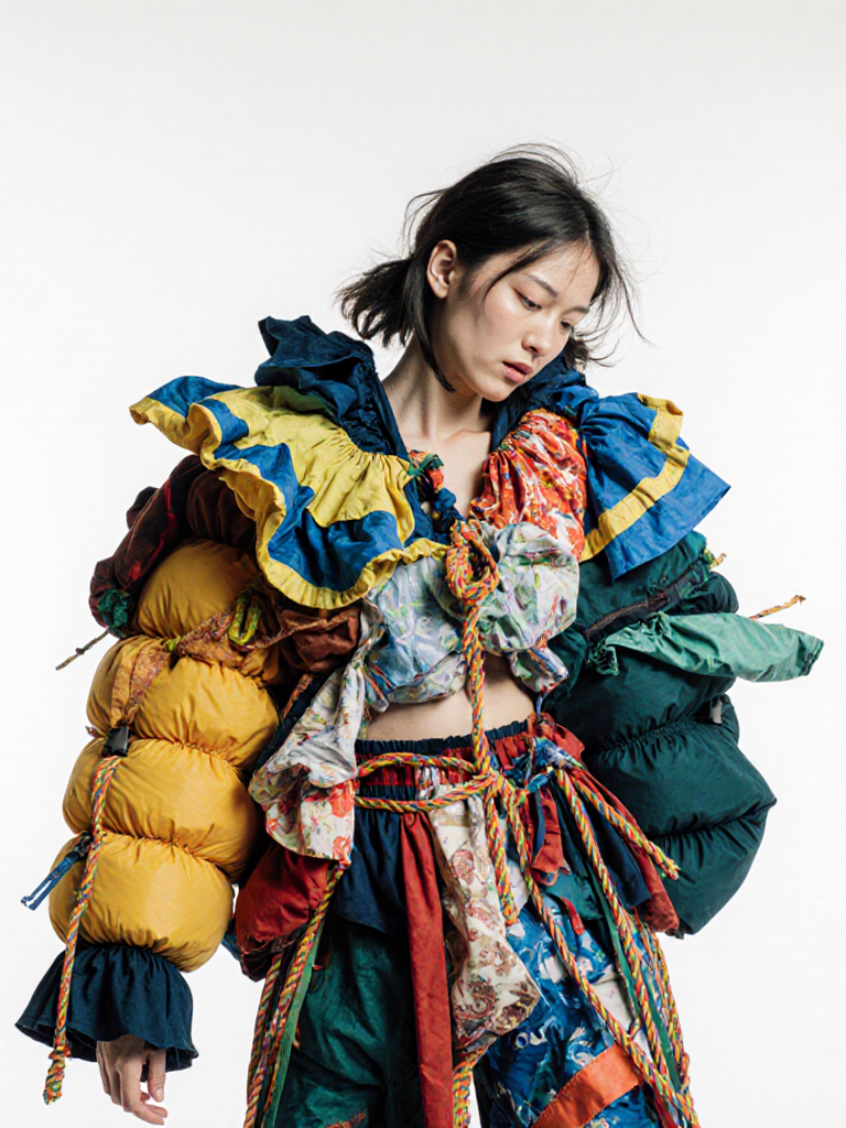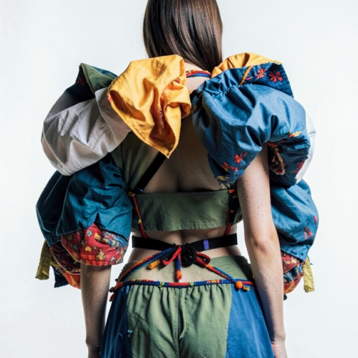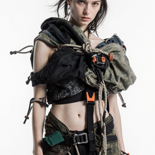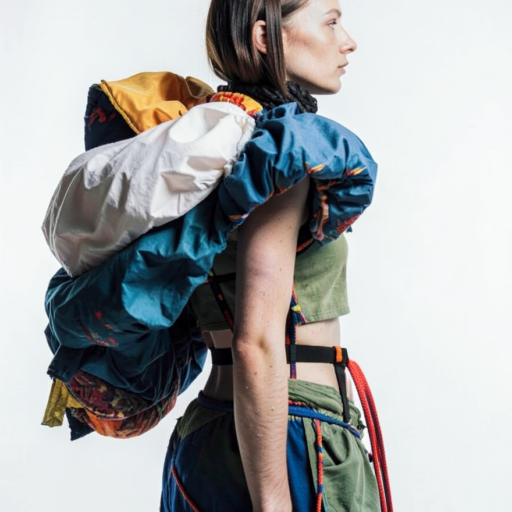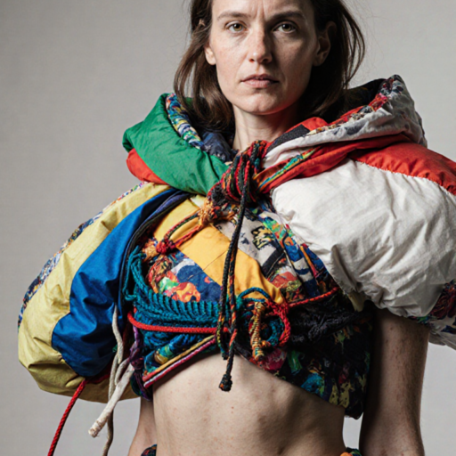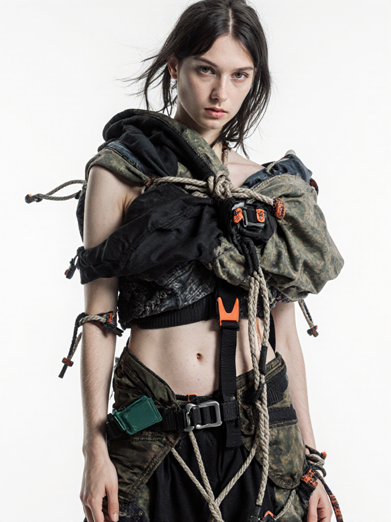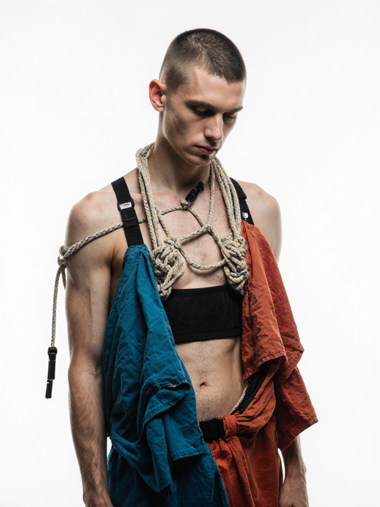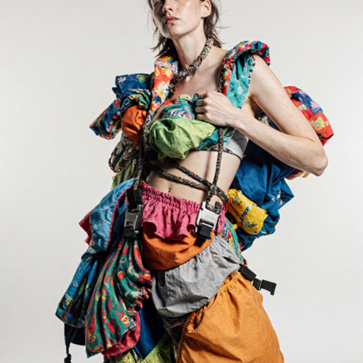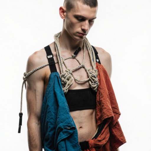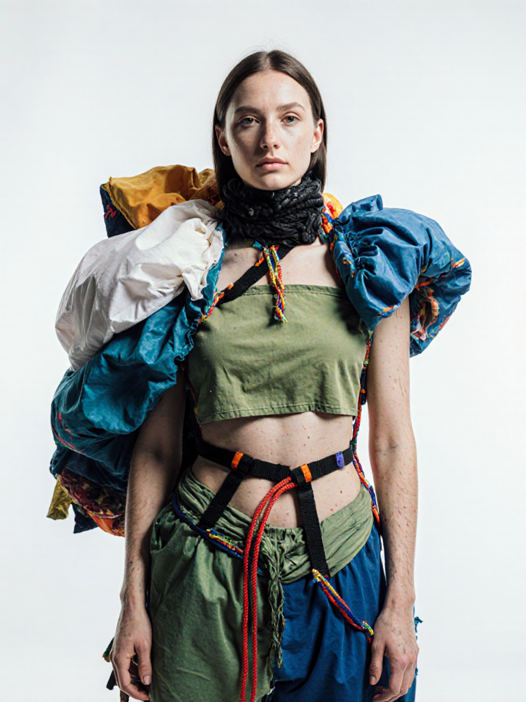 tied-up recycled ski clothes, textile scraps, colorful syntetic outdoor fabric are attached loosely to the body. The synthetic textile components are arranged in a wild, chaotic, and asymmetrical manner and are improvised to the body with thin ropes, Velcro, and small straps. with overlaps, multi layered, twisted, folded, inflated, collaged.