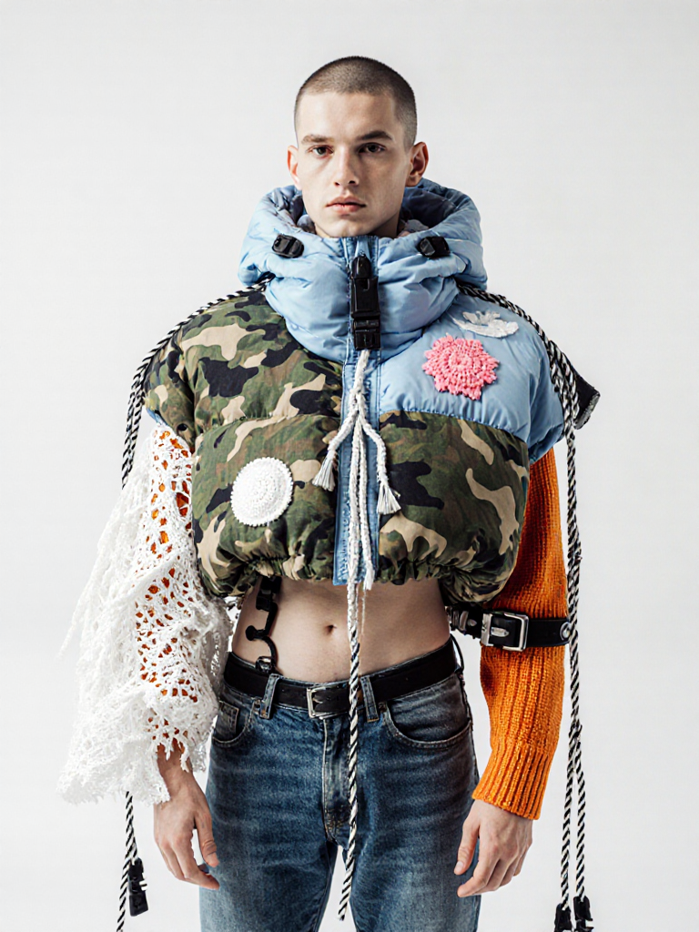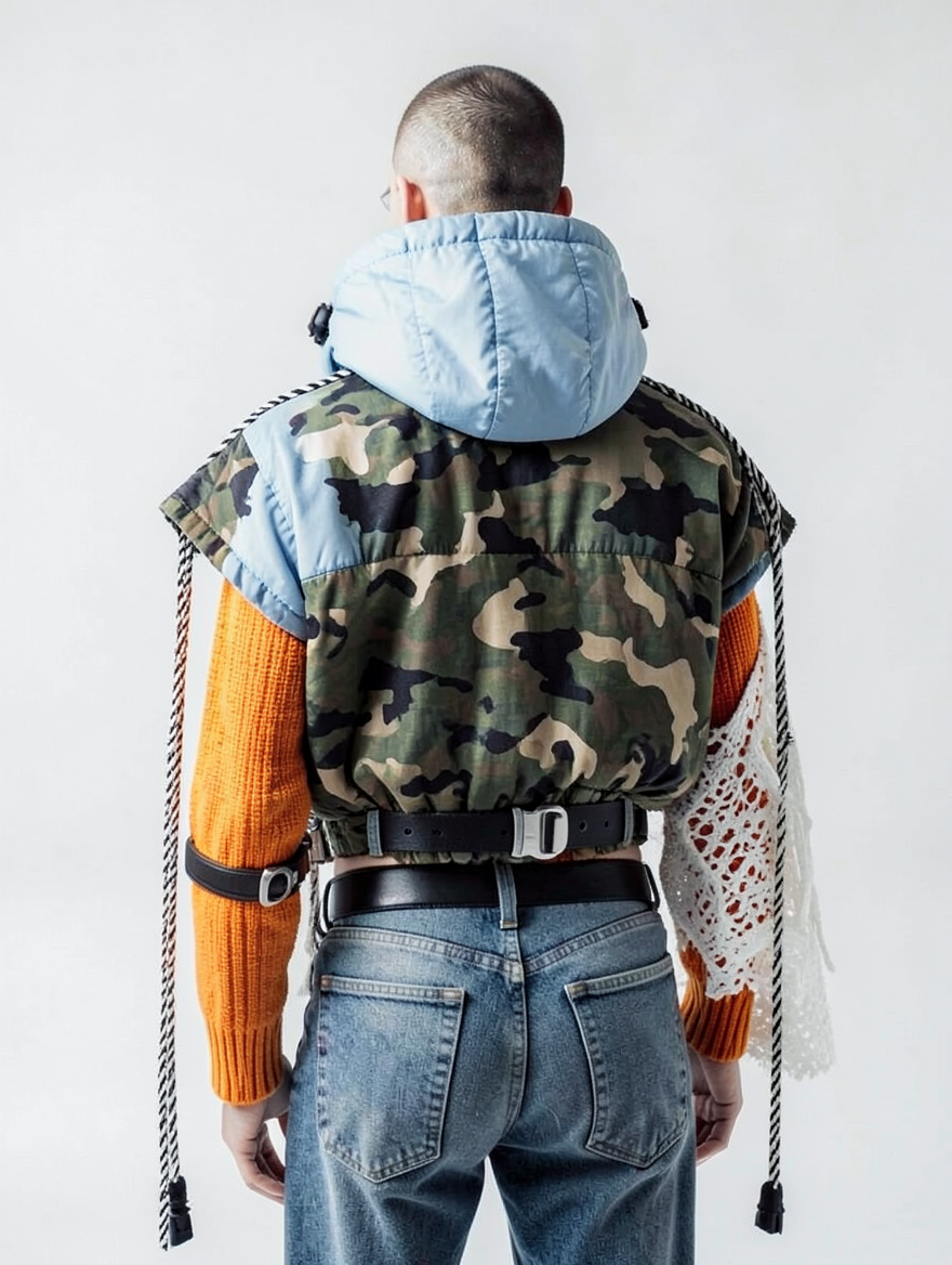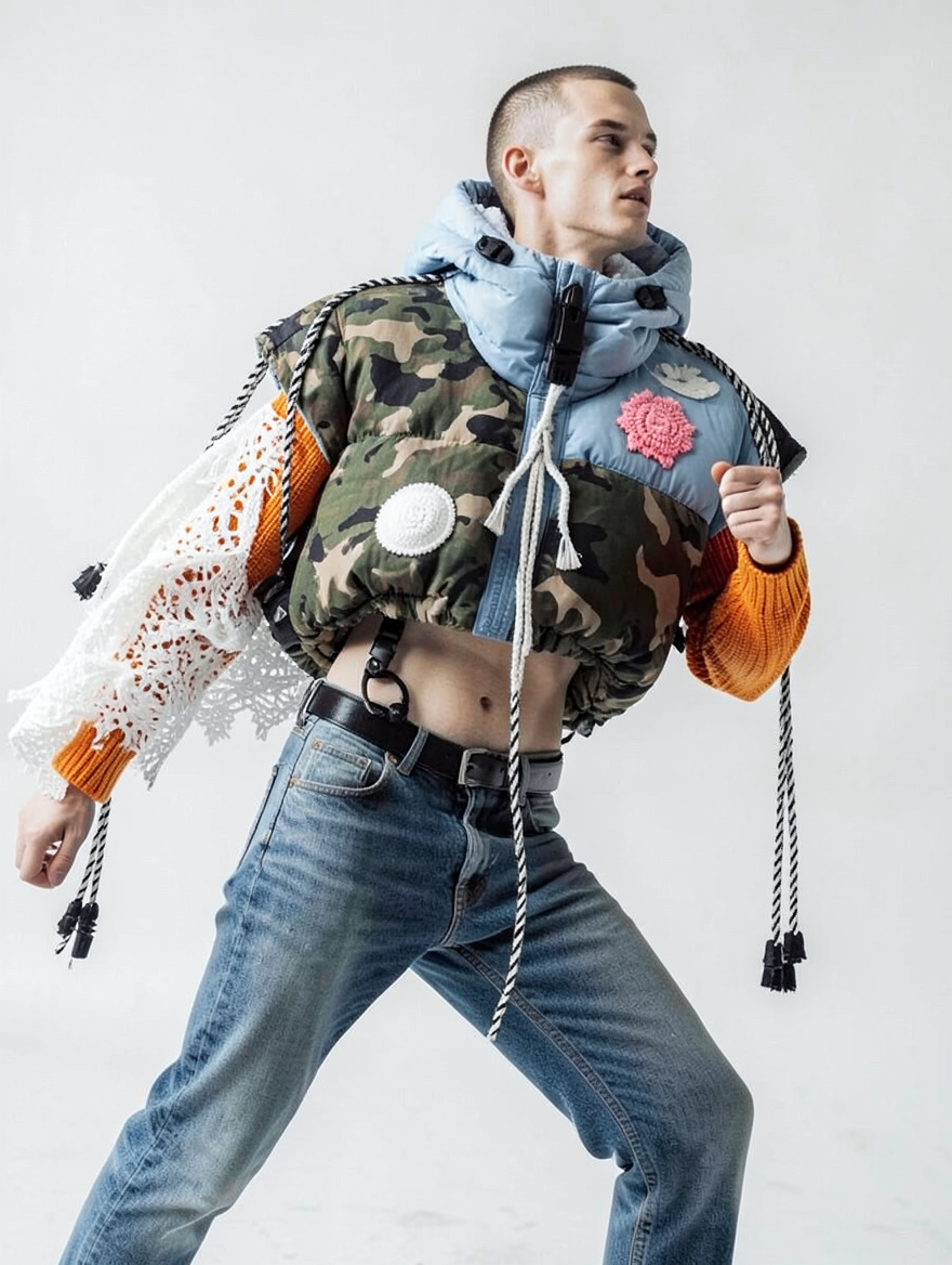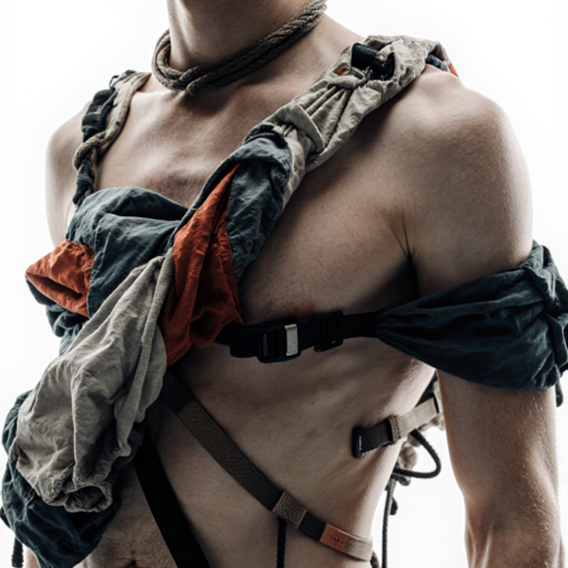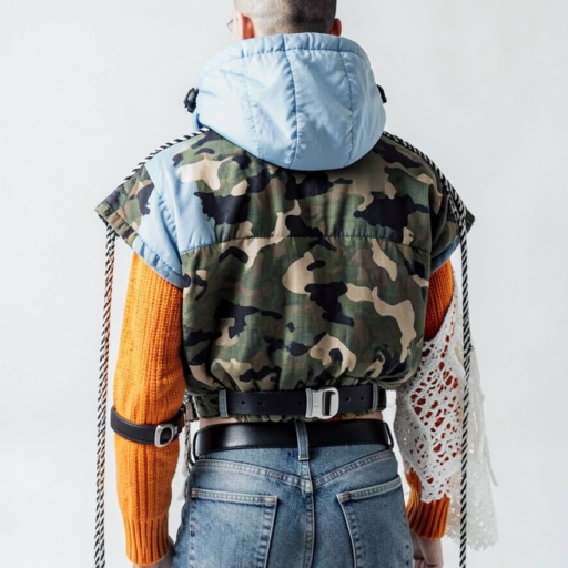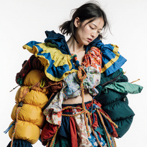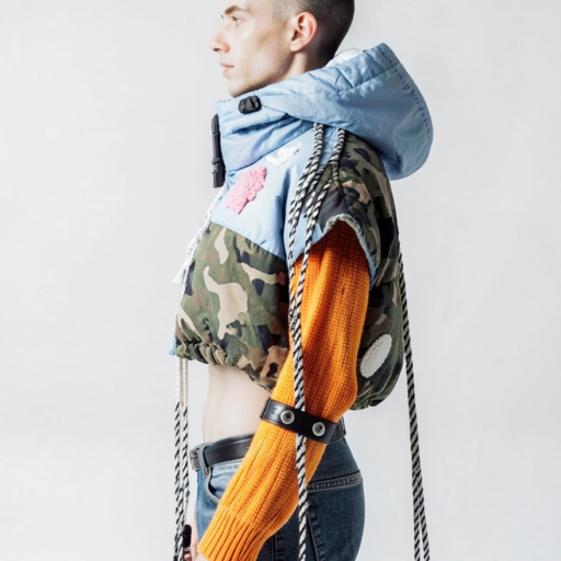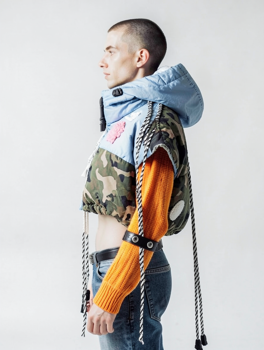tied-up recycled ski clothes, textile scraps, colorful syntetic outdoor fabric are attached loosely to the body. The synthetic textile components are arranged in a wild, chaotic, and asymmetrical manner and are improvised to the body with thin ropes, Velcro, and small straps. with overlaps, multi layered, twisted, folded, inflated, collaged.