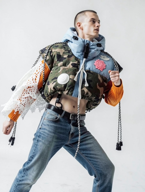The textile components are arranged decomposed in a wild, chaotic, and asymmetrical manner and are improvised wrapped to the body with thin ropes, Velcro, and small straps. with overlaps, multi layered, twisted, folded, inflated, collaged.