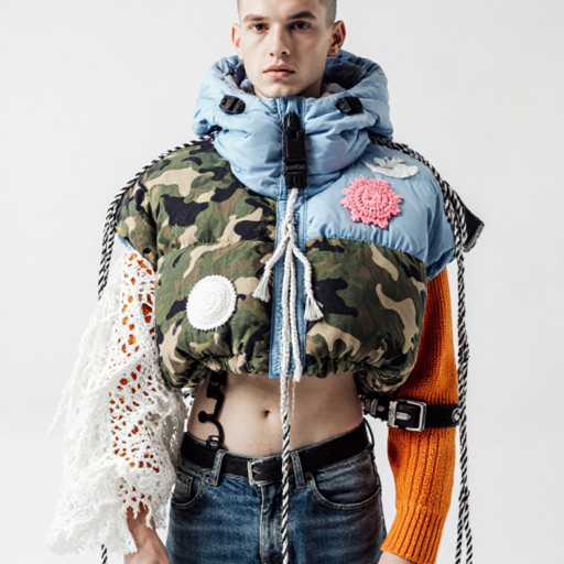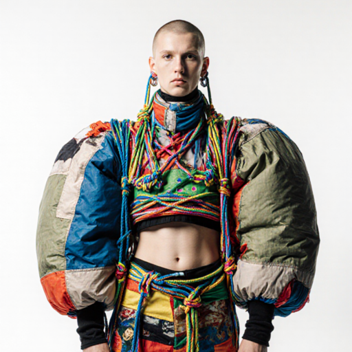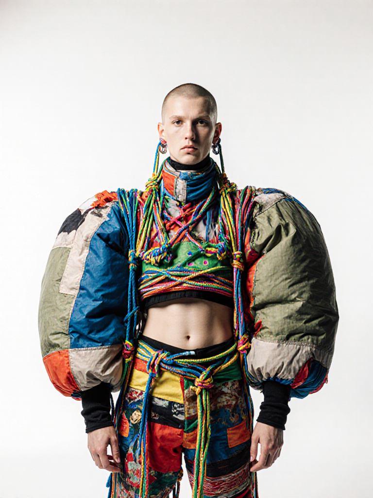 the cords and straps that hold the outfit together show basic macrame knitting style. inflated down style fat puffed textile elements.