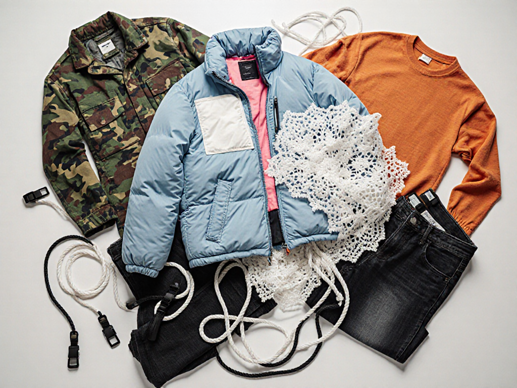 pieces of an oversized thick light blue ski down jacket with white and pink applications