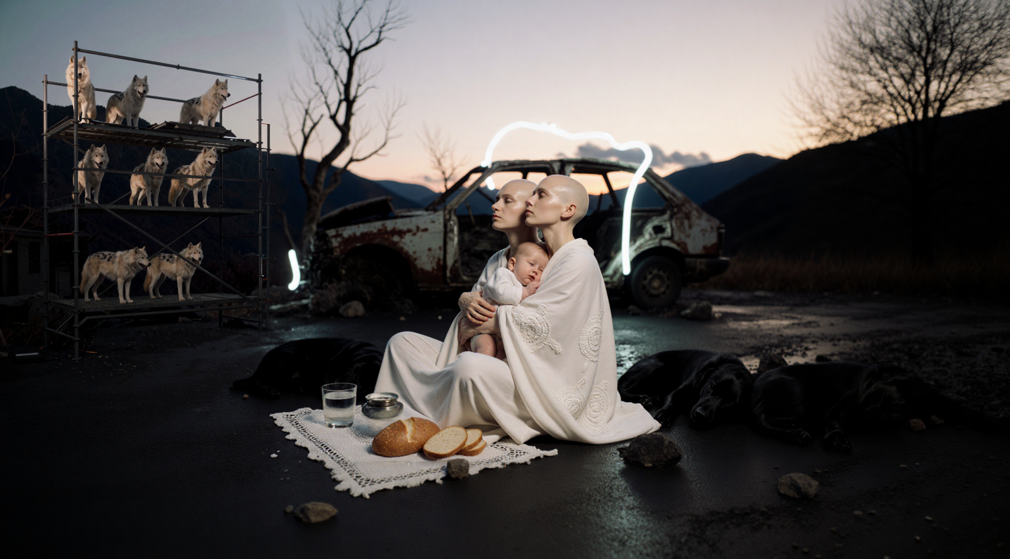 two androgynous adult male bald persons in their late 30s sitting on the floor, cuddled up behind each other. One bald adult female person is holding a baby in their arms, the other person tightly in their arms from behind in a dramatic pose, initmately, emotionally – both seem to be exhausted.